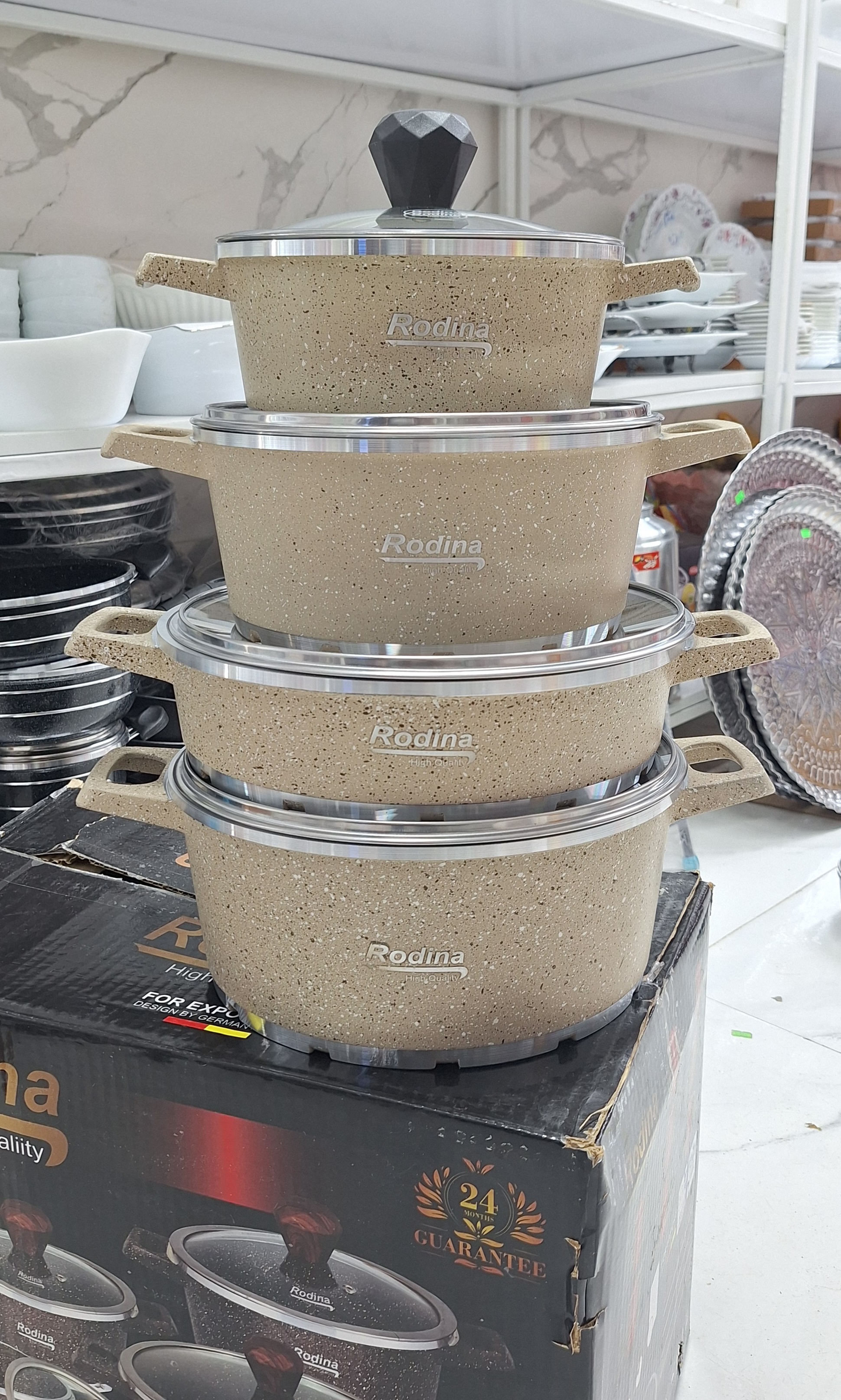 - تعداد قطعات: 8 پارچه (3 قابلمه + 1 تابه دربدار + دربها)